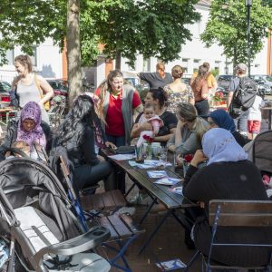 Im strahlenden Sonnenschein verlagerte das Faserwerk seine Siebdruckwerkstatt auf den Ottoplatz, wo mit der helfenden Hand von Peter zahlreiche T-Shirts und Einkaufsbeutel mit neuen individuellen Motiven bedruckt wurden. Auch die Nähmaschinen des Faserwerks ratterten mitten auf dem Platz und Groß und Klein haben gemeinsam eine kunterbunte Wimpelkette für den Ottoplatz genäht. Beim Kleidertauschmarkt „my trash is your treasure“, organisiert vom Hazel S/W, fanden Kleidungsstücke neue Besitzer*innen.