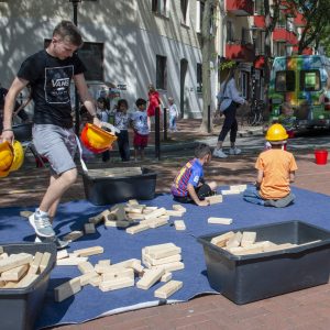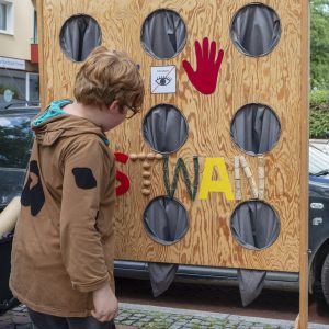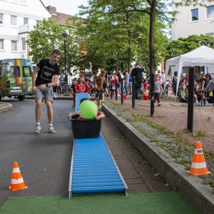 Weiterhin wartete das Go20 Spielmobil und viele weitere Spielangebote: eine „Seifenkistenrutsche“, mit der größere und kleinere Kinder die für den Tag gesperrte Hermanstraße herunter rutschen konnten. Außerdem der „Tower auf Power“ des Kinderschutzbunds: Hier konnten die Kinder nicht nur spielerisch erfahren, was man erreichen kann, sondern auch wie man gemeinsam an einem Ziel arbeitet. Und beim Angebot der Diakonie Himmelstür, einer Tast- und Fühlstation, konnten die Sinne und das Gemeinschaftsgefühl geschärft werden. Hierbei ertasteten kleine Hände verschiedene Materialien wie Walnüsse und Kaffeebohnen.