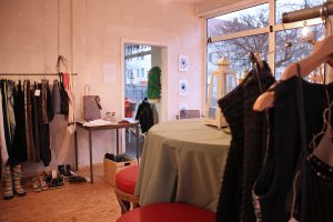 Janas Augen beginnen zu strahlen. Jegliches Interesse am Faserwerk ist ihr willkommen, denn sie leitet diesen Projektraum: „Wir sammeln Kleidung für unsere Upcycling-Workshops. Das ist ein modisches Verfahren, alten, abgetragenen, ausgedienten Dingen neues Leben einzuhauchen.“ Während die Jana noch mehr über Upcycling erzählt, kommen weitere Leute in den Laden. Denn das Faserwerk wird seit seiner Eröffnung im Oktober 2018 immer bekannter und zu einembeliebtenTreffpunkt im Viertel. Jeden Montag und Donnerstag zwischen 15 und 19 Uhr kann man Siebdruck, Nähmaschine und Fotolabor im betreuten Coworking nutzen. Oder einfach nur auf einen Tee, Kekse und einen Schnack reinschauen.