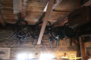 …denn auf der Agenda stand schon länger eine größere Aufgabe: Den Dachboden der KUFA ausmisten und aufräumen… Dieser Dachboden ist jedoch kein gewöhnlicher Dachboden, er ist gleichzeitig Lager, Archiv, Museum und Inspirationsquelle. Wenn man die Gittertür neben der Loretta öffnet offenbart sich noch eine Treppe. Wenn man diese Treppe hoch geht kommt man an eine Kreuzung. Zwei Türen, eine links, die andere rechts. Und jetzt? Rein ins staubige Dunkel!