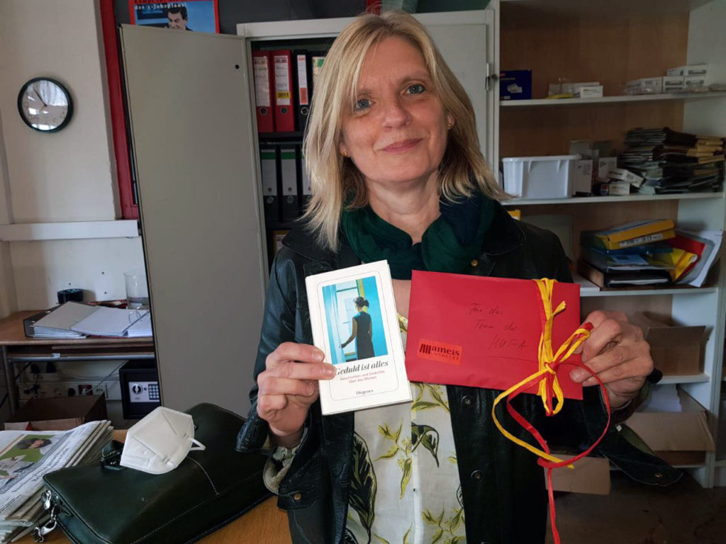Juhu! Eine Spende! 800 Euro hat die KUFA von ameis Buchecke geschenkt bekommen. Die Geschäftsführerin Christine Rusch-Walter kam höchstpersönlich in der KUFA vorbei, um die Spende zu überreichen. Gerade jetzt sei es wichtig, Kultur zu unterstützen und was Schönes draus zu machen, meint sie. Welch guter Ansporn!