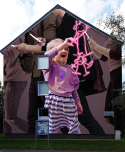 Für die Triftäckerstraße 46 hat innerfields, das Duo bestehend aus Jakob Tory Bardou und Holger Weißflog zwei Entwürfe für die Fassade erstellt. Das Kollektiv aus Berlin ist bekannt für seine realistischen und humorvollen Darstellungen, die den Menschen als Teil der Natur und gleichzeitig die Entfernung von derselbigen in unserer technisierten, künstlich erschaffenen Welt aufzeigen. Der gewählte Entwurf zeigt ein Mädchen, dass zwei leuchtende, tanzende Figuren in die Luft zeichnet. An ihr gehen die Erwachsenen Figuren achtlos vorbei und schauen nur auf ihr Handy. Vom 16. Oktober bis zum 20. Oktober haben innerfields die Fassade gestaltet.