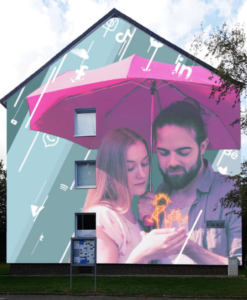 Im zweiten Entwurf thematisieren wir die Stärke, die wir durch einen gemeinsamen Zusammenhalt haben. Das Pärchen rückt hier, unter einem Schirm, zusammen um vor dem erneuten Schauer von digitalen Einflüssen, für eine Zeit geschützt zu sein. In diesem Zusammenrücken nutzen sie den Schutzraum, um sich auf eine häufig stark überlagerte Kraft zu fokussieren. Die kindliche Fantasie. Auch hier haben wir die beiden tanzenden Figuren aus einer Zeichnung entstandenen in einem Workshop von „Stadtfeld zeigt Gesicht“ verwendet. Sie bewahren und schützen sie mit ihren Händen und erfreuen sich an der naiven Kraft dieser Schöpfung. Fast mutet es so an, als ob sie gemeinsam, im Angesicht der tanzenden Figürchen, eine positive Entscheidung treffen.