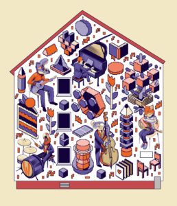 In ihrem 2. Entwurf steht die Gemeinschaftlichkeit und Geselligkeit im Vordergrund. So stehen beispielsweise die verschiedenen Musikinstrumente als Symbol für Musik, der Pflaumenkuchen und Kaffee als Zeichen der Gemütlichkeit, Wurst und Grill stellvertretend für Geselligkeit und der Sandkasten inkl. Der Sanduhr – die auch als Rutsche gelesen werden kann – für den anliegenden Spielplatz und die Kinder im Stadtteil.