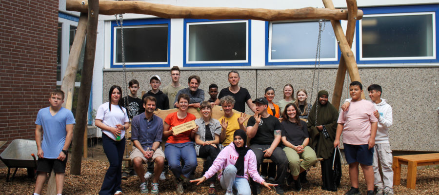 Die Geschwister-Scholl-Schule hat nun wieder einen schönen Innenhof! Die letzte Woche vor den Sommerferien wurde zur Bauwoche: Schüler*innen der Sprachlernklasse und Lehrer*innen packten gemeinsam an, angeleitet und unterstützt von einem Projektteam der Kulturfabrik. Es entstanden neue Sitzmöbel aus Robinienholz, neue Beete wurden angelegt und bepflanzt und eine hängende Bank errichtet.