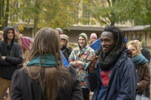 Vor den Werken, meist den großen Flächen, bleiben wir stehen. Wir verharren. Mal erzählt Projektleiterin Lina Czapla. Dann wieder erzählen die Künstler*innen. Wir hören die Geschichten, die hinter den Bildmotiven stehen. Wir sehen die Kunstwerke und lassen sie auf uns wirken. Oder wir sehen die Künstler*innen vor unserem geistigen Auge. Wie sie tagelang, mehrere Wochen mit Spraydosen, Mundschutz, Handschuhen, Skizzen und auch im September schon mit Regenschirmen die Nordstadt belagerten, um sie zu gestalten. Bunter zu machen.