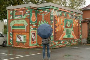 Es ist ein Sonntag im Oktober. Es regnet leicht. Am Nordausgang des Hildesheimer Hauptbahnhofs versammelt sich eine etwa 80-köpfige Truppe Menschen. Als wir losgehen, sieht es aus als würde ein bunter Strom durch die Straßen in die Nordstadt fließen. Doch es sind nicht nur die bunten Regenjacken und Schirme, die Farbe in den blassen Herbsttag und das graue Betonlabyrinth bringen. Unser Spaßziergang führt uns entlang jener Hausfassaden, die in den vergangenen Jahren verschönert, und hin zu den Trafohäuschen und Stromkästen, die dieses Jahr verziert wurden.