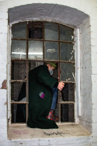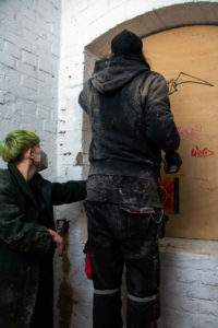 Ausgestattet mit einem Baustrahler klettern in den Schacht und befinden uns auf einmal in einem schmalen, staubigen Gang- um genau zu sein zwischen einer Stützmauer, die das Gebäude davor bewahrt, den Hang hinunter zu rutschen, sowie der Außenmauer der Kulturfabrik. Schmal und staubig ist es hier. Wir schaben den dreißig Jahre alten Staub von den Wänden ab und laufen vorsichtig über Bauschutt, während Schwalle anfängt zu erzählen. Schwalle war 1995 das letzte Mal in dem Schacht. „Mit meinen eigenen Händen habe ich damals die KUFA ausgegraben“ erzählt er und lacht dröhnend. „Da war steinharter Lehmboden, den wir aufgeschlagen haben mit der Picke. Ewig hat das gedauert. Sonst wäre die KUFA weggerutscht!“ Ein Rohr ragt aus der Wand, wir krabbeln drunter, um weiter zu kommen.