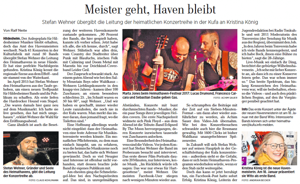 „Stefan Wehner übergibt die Leitung der heimatlichen Konzertreihe an Kristina König“, schreibt die Hildesheimer Allgemeine Zeitung am 3. Januar 2019: