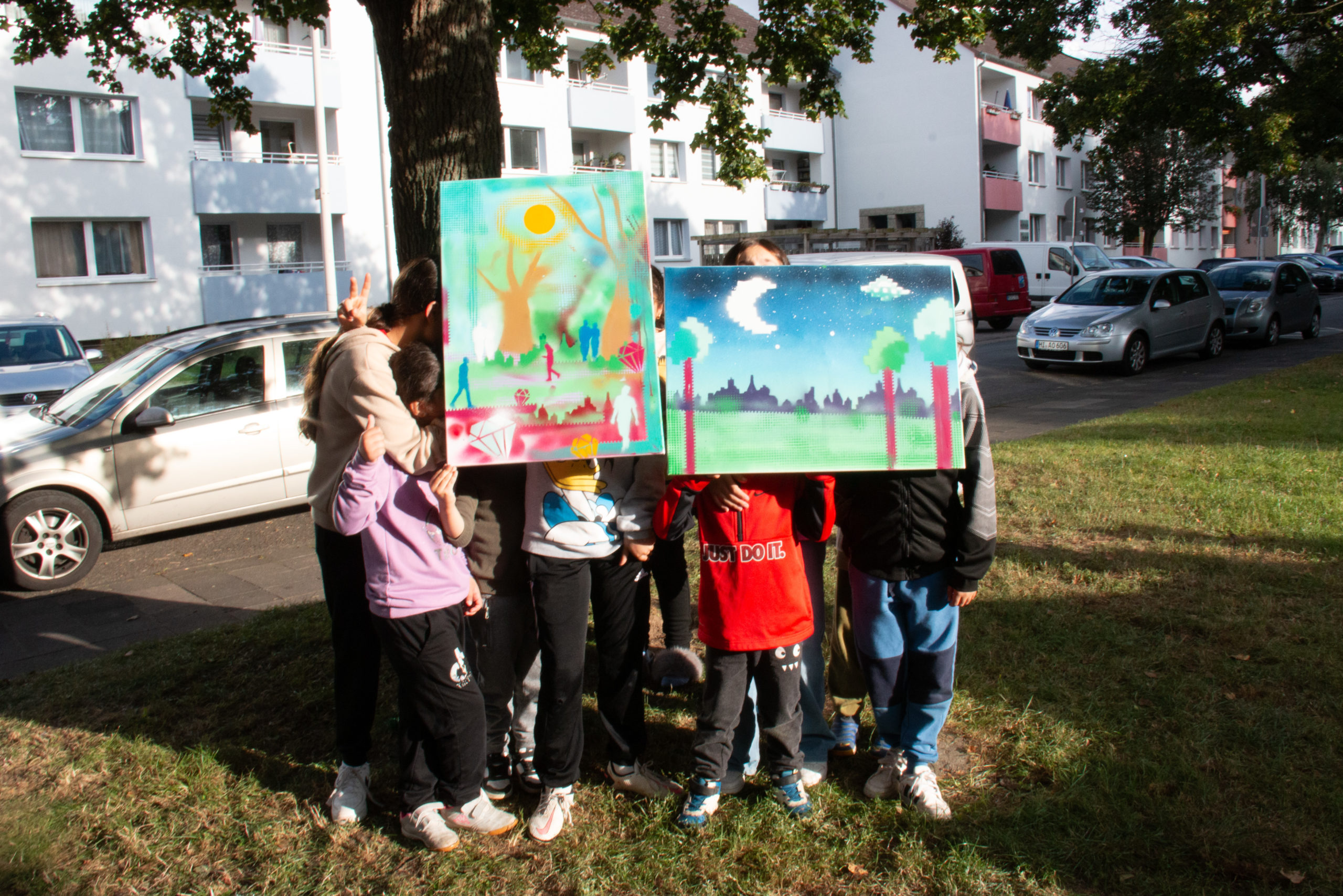 Freitag, 22. September ab 15 Uhr: Bügelperlen, Malen auf Kästchenpapier und Sprayen mit Schablone. Bei diesem Pixel-Art-Workshop vor der Fassade in der Triftäckerstraße 63 von Rookie the Weird und DXTR the Weird konnten 20 Kinder des Stadtfelds, angeleitet von Graffiti-Künstler Ole Görgens und der Kunstvermittlerin Maren Pfeiffer, ausprobieren, wie aus einer natürlichen Abbildung eine Darstellung in Pixel-Optik entsteht.