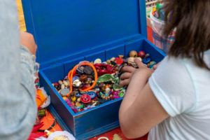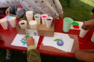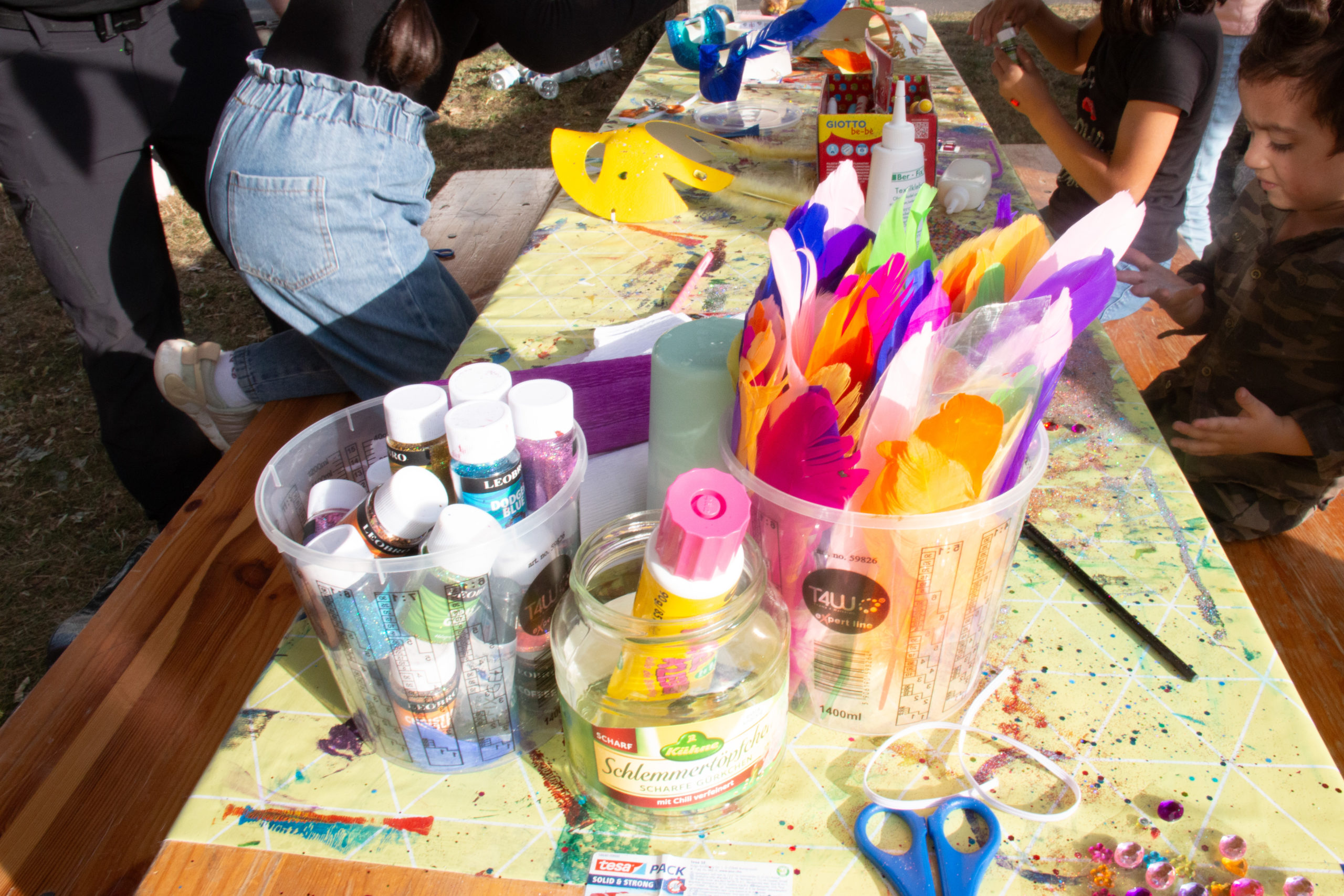Mittwoch, 27. September ab 15 Uhr: Glitzerstaub, Federn und sehr viel Acrylfarbe: Angeregt durch die expressive und farbenfrohe Ausdrucksweise der Künstlerin JuMu Monster gestalteten 20 Kinder in einer zweistündigen Aktion bunte Masken. Angeleitet wurden sie vom Requisiteur des tfn Nick Meyer und der Kunstvermittlerin Maren Pfeiffer.