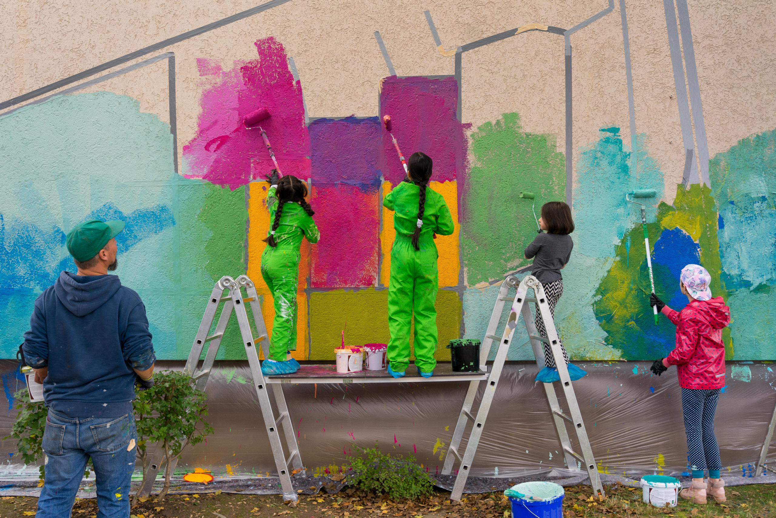 Donnerstag, 26.10.: Gesellschaftsspiele kennen lernen. Die Künstlerin Helen Bur malte eine Szene aus dem Stadtfeld auf die Fassade in der Triftäckerstraße 31: Eine Gruppe von Freund*innen trifft sich vor ihrem Haus zum Spielen, dazu gibt es Kuchen und türkischen Tee. Die Hausaufgabenhilfe ETUI ludt zeitgleich alle zu einem lockeren Nachmittag vor der Fassade mit verschiedenen Spieleklassikern ein.
